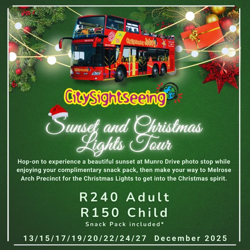 City Sightseeing Johannesburg invites you to hop on board for a magical Sunset and Christmas Lights Tour this festive season. The experience begins with a golden-hour photo stop at Munro Drive, where guests can watch the sun dip below Johannesburg’s skyline while savouring a complimentary snack pack. The tour then glides into the vibrant Melrose Arch Precinct to wander under dazzling lights, the perfect spot for shopping, dining, and festive outdoor fun.