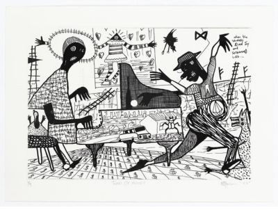 The final works not only translate Blessing’s painterly gestures into copper and ink, but also extends his ongoing exploration of African expression, rhythm, and interconnectedness through body and sound.