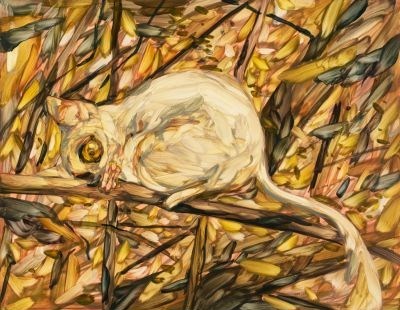 Fourie’s paintings function as emotional landscapes, where curious creatures peer through foliage or rocky apertures, meeting the viewer’s gaze with a quiet question. With sensitivity and wit, she reflects on what it means to be a “primate” in an increasingly artificial world — still wild at heart, but unsure how to belong in the wild.