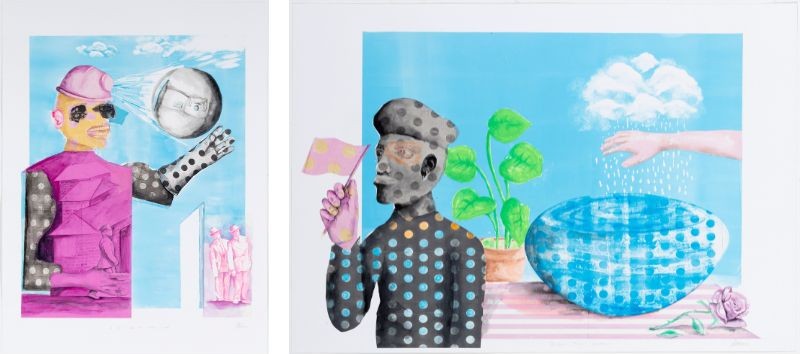 The works are intimate in scale, pared down in colour, and relatively simple in composition. Limiting his palette to two or three tones and introducing only minimal chine-collé elements, Ntuli focuses on clarity and restraint rather than the densely layered approach seen in his larger works. They are assembled using fragments of pronto-lithography, painting, chine-collé, and collage, including elements of found imagery, handwritten notes, and online advertisements. By collaging these disparate elements, the series maps the tension between need and fantasy, utility and ornament, self and society. For the artist, each work acts as a speculative inventory — a personal and collective record of what is longed for, bought, saved, or imagined.